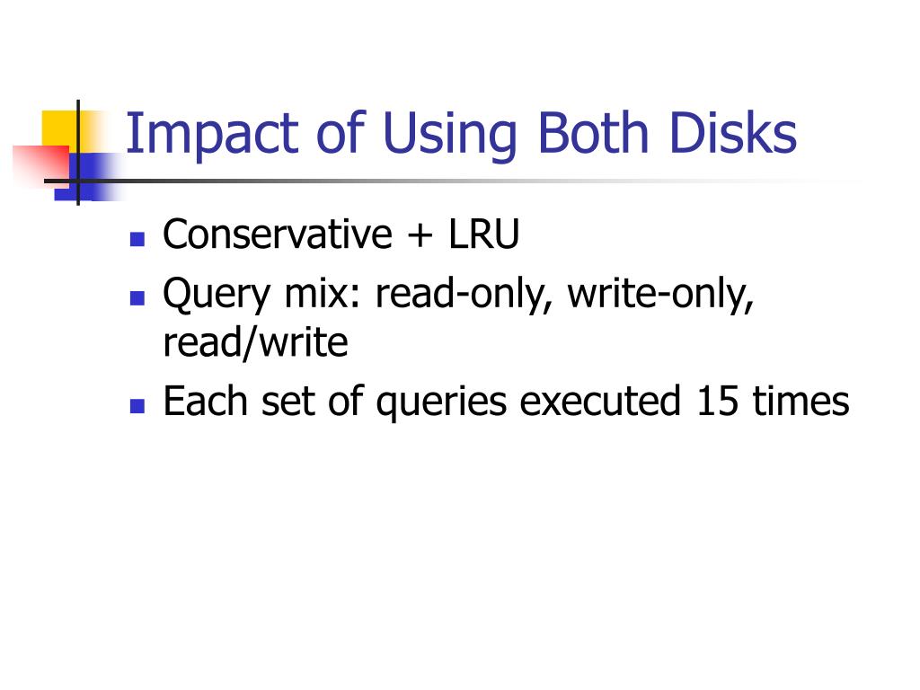 Impact of Using Both Disks • Conservative + LRU • Query mix: read-only, write-only, read/write • Each set of queries executed 15 times