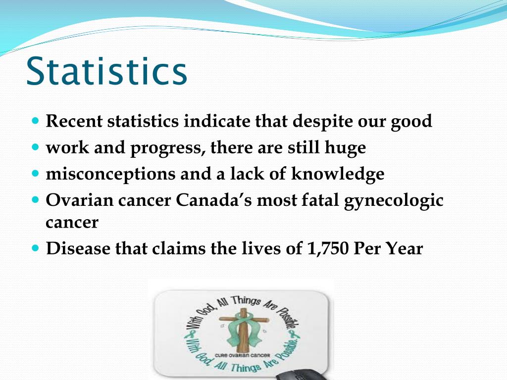 Statistics • Recent statistics indicate that despite our good • work and progress, there are still huge • misconceptions and a lack of knowledge • Ovarian cancer Canada’s most fatal gynecologic cancer • Disease that claims the lives of 1,750 Per Year