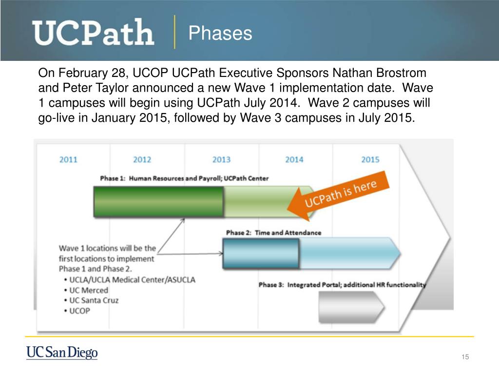 Phases On February 28, UCOP UCPath Executive Sponsors Nathan Brostrom and Peter Taylor announced a new Wave 1 implementation date. Wave 1 campuses will begin using UCPath July 2014. Wave 2 campuses will go-live in January 2015, followed by Wave 3 campuses in July 2015.