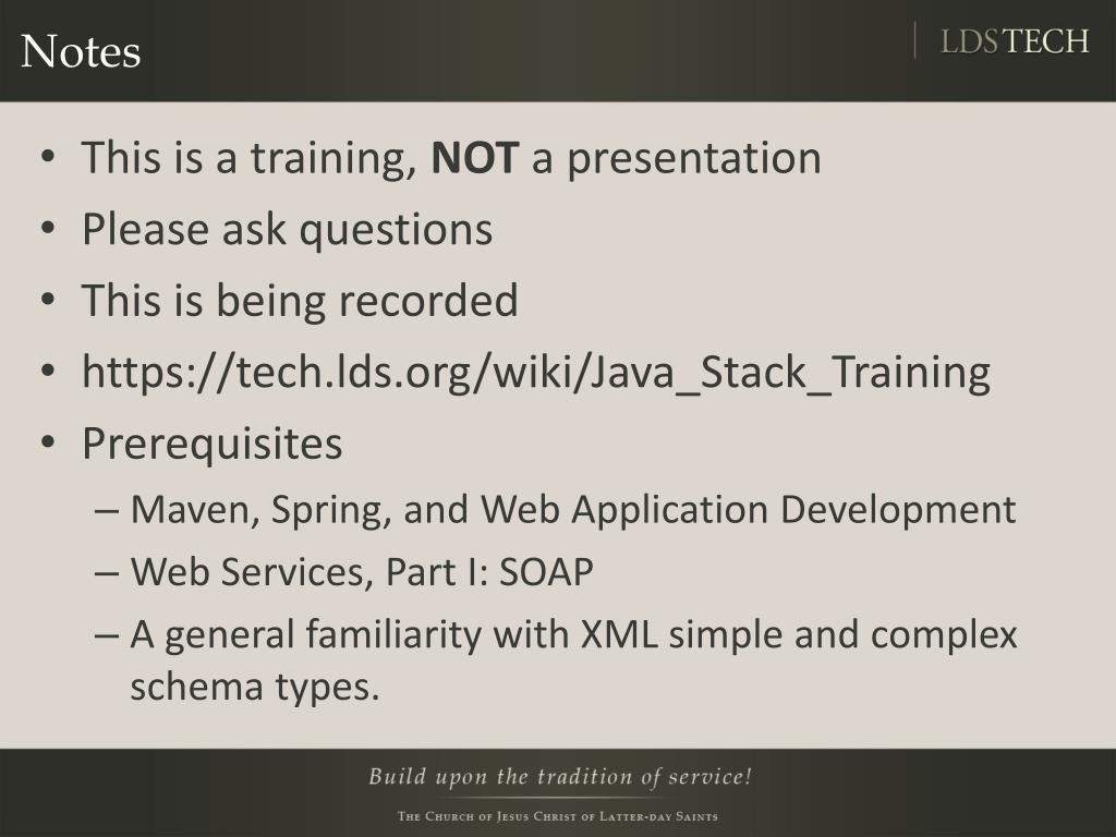 Notes • This is a training, NOT a presentation • Please ask questions • This is being recorded • https://tech.lds.org/wiki/Java_Stack_Training • Prerequisites • Maven, Spring, and Web Application Development • Web Services, Part I: SOAP • A general familiarity with XML simple and complex schema types.
