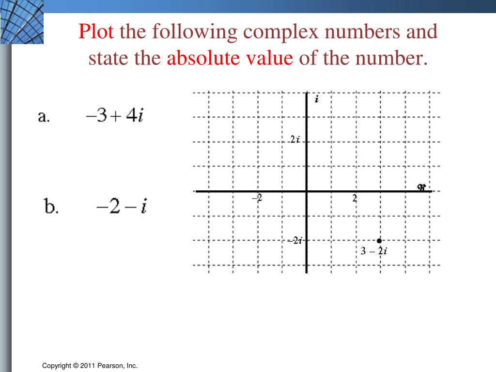 What you’ll learn about • The Complex Plane (Day 1) • Trigonometric Form of Complex Numbers (Day 1) • Multiplication and Division of Complex Numbers (Day 2) • Powers of Complex Numbers (Day 3) • Roots of Complex Numbers (Day 3) … and why The material extends your equation-solving technique to include equations of the form zn = c, n is an integer and c is a complex number.