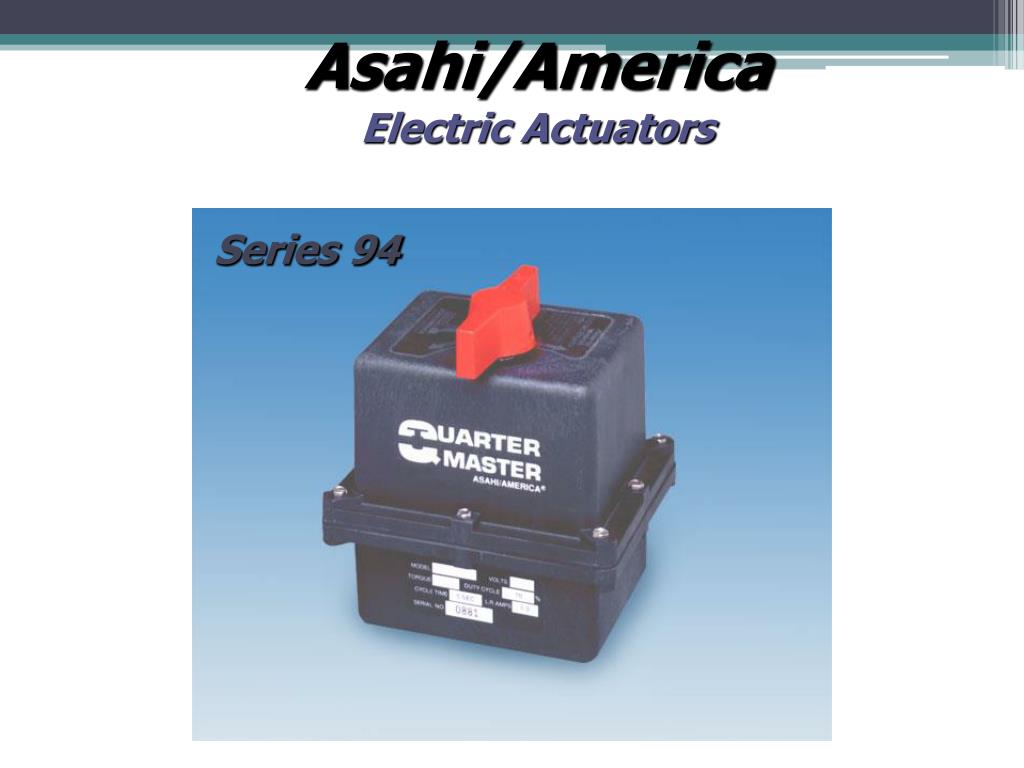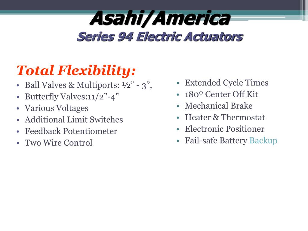 Asahi/America Series 94 Electric Actuators • Extended Cycle Times • 180º Center Off Kit • Mechanical Brake • Heater & Thermostat • Electronic Positioner • Fail-safe Battery Backup Total Flexibility: • Ball Valves & Multiports: ½” - 3”, • Butterfly Valves:11/2”-4” • Various Voltages • Additional Limit Switches • Feedback Potentiometer • Two Wire Control