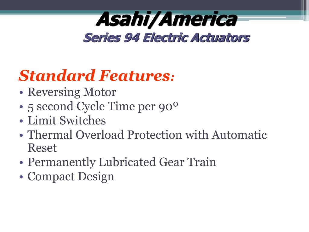 Asahi/America Series 94 Electric Actuators Standard Features: • Reversing Motor • 5 second Cycle Time per 90º • Limit Switches • Thermal Overload Protection with Automatic Reset • Permanently Lubricated Gear Train • Compact Design