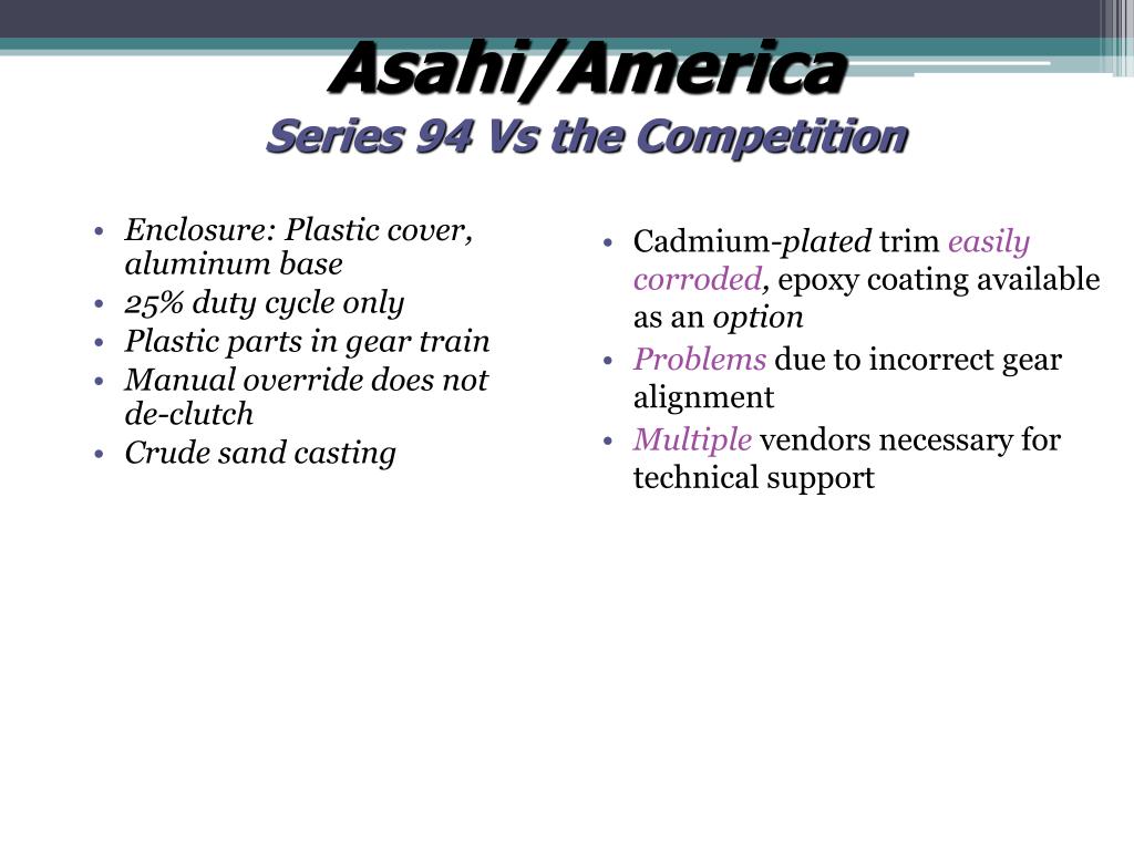 Asahi/America Series 94 Vs the Competition • Cadmium-plated trim easily corroded, epoxy coating available as an option • Problems due to incorrect gear alignment • Multiple vendors necessary for technical support • Enclosure: Plastic cover, aluminum base • 25% duty cycle only • Plastic parts in gear train • Manual override does not de-clutch • Crude sand casting