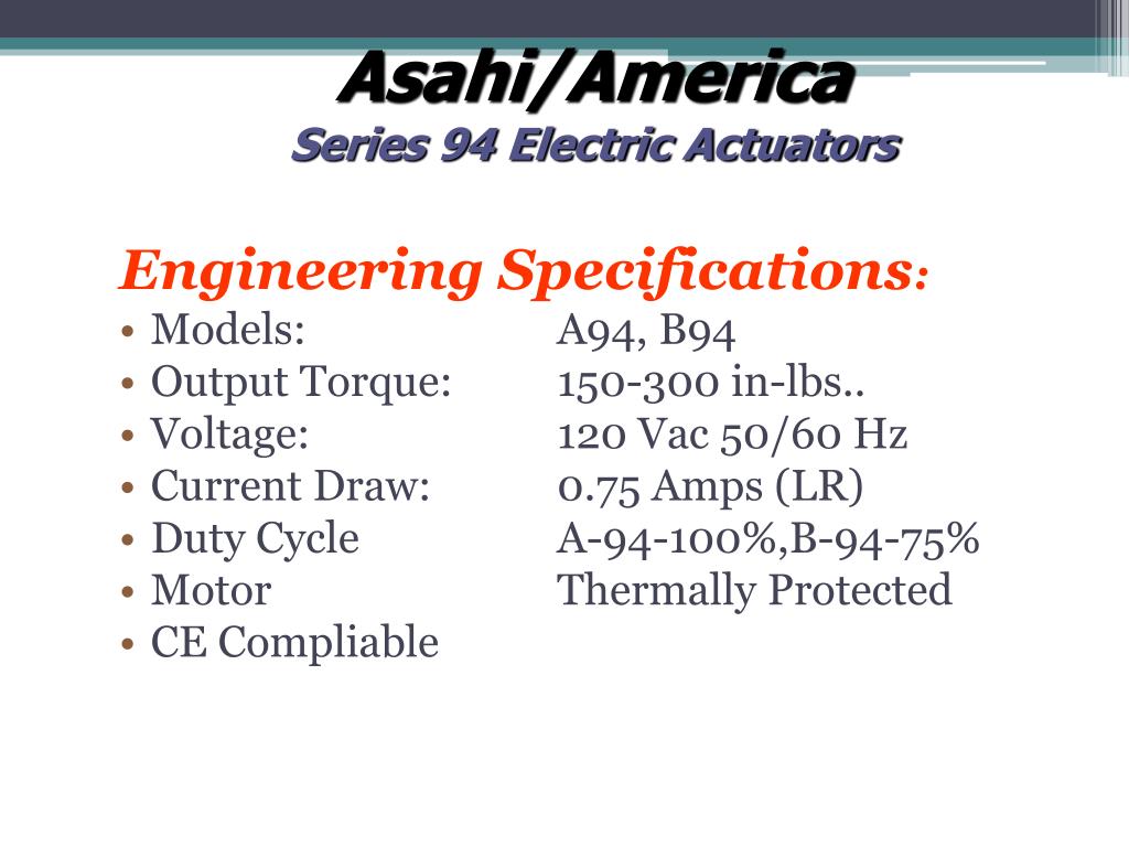 Asahi/America Series 94 Electric Actuators Engineering Specifications: • Models: A94, B94 • Output Torque: 150-300 in-lbs.. • Voltage: 120 Vac 50/60 Hz • Current Draw: 0.75 Amps (LR) • Duty Cycle A-94-100%,B-94-75% • Motor Thermally Protected • CE Compliable