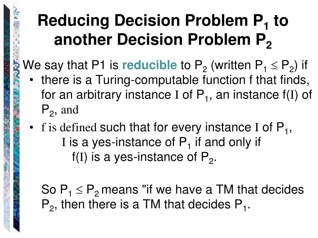 Reducing Decision Problem P1 to another Decision Problem P2 We say that P1 is reducibleto P2 (written P1 P2) if • there is a Turing-computable function f that finds, for an arbitrary instance I of P1, an instance f(I) of P2, and • f is defined such that for every instance I of P1, I is a yes-instance of P1 if and only if f(I) is a yes-instance of P2. So P1 P2 means "if we have a TM that decides P2, then there is a TM that decides P1.