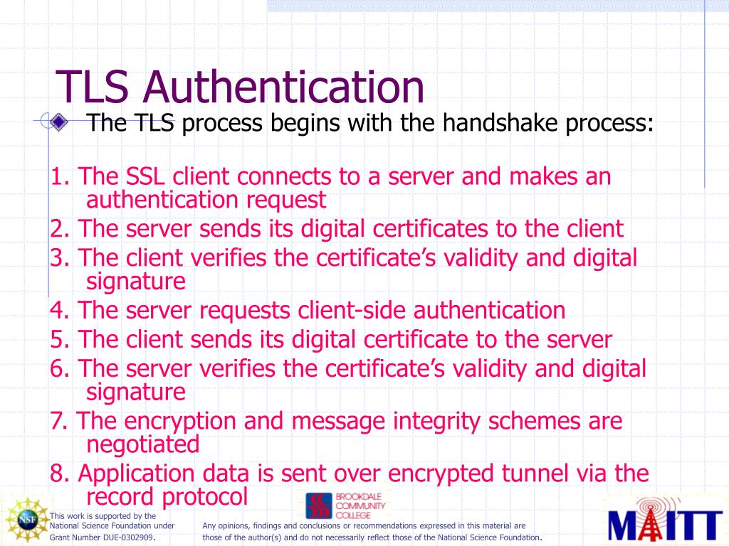 TLS Authentication • The TLS process begins with the handshake process: 1. The SSL client connects to a server and makes an authentication request 2. The server sends its digital certificates to the client 3. The client verifies the certificate’s validity and digital signature 4. The server requests client-side authentication 5. The client sends its digital certificate to the server 6. The server verifies the certificate’s validity and digital signature 7. The encryption and message integrity schemes are negotiated 8. Application data is sent over encrypted tunnel via the record protocol