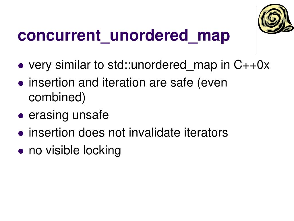 concurrent_unordered_map • very similar to std::unordered_map in C++0x • insertion and iteration are safe (even combined) • erasing unsafe • insertion does not invalidate iterators • no visible locking