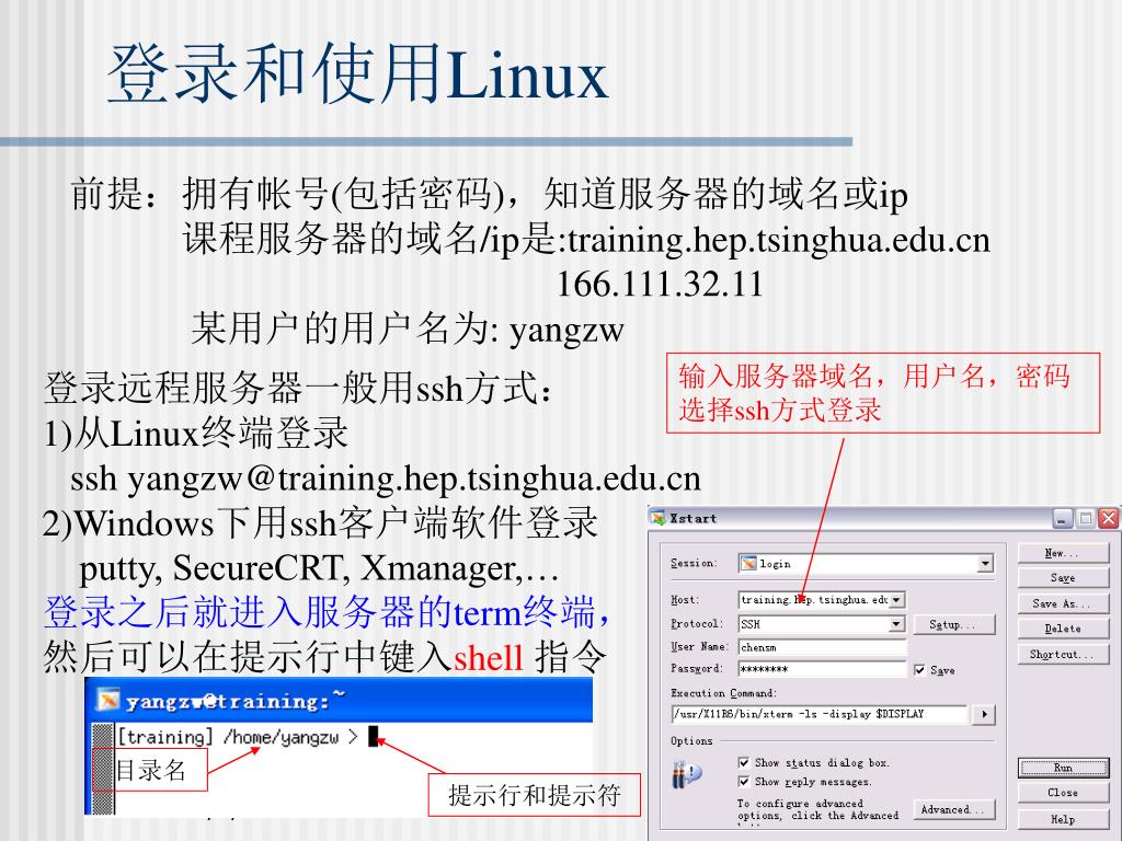 登录和使用Linux 前提:拥有帐号(包括密码),知道服务器的域名或ip 课程服务器的域名/ip是:training.hep.tsinghua.edu.cn 166.111.32.11 某用户的用户名为: yangzw 输入服务器域名,用户名,密码 选择ssh方式登录 登录远程服务器一般用ssh方式: 1)从Linux终端登录 ssh yangzw@training.hep.tsinghua.edu.cn 2)Windows下用ssh客户端软件登录 putty, SecureCRT, Xmanager,… 登录之后就进入服务器的term终端, 然后可以在提示行中键入shell指令 目录名 提示行和提示符