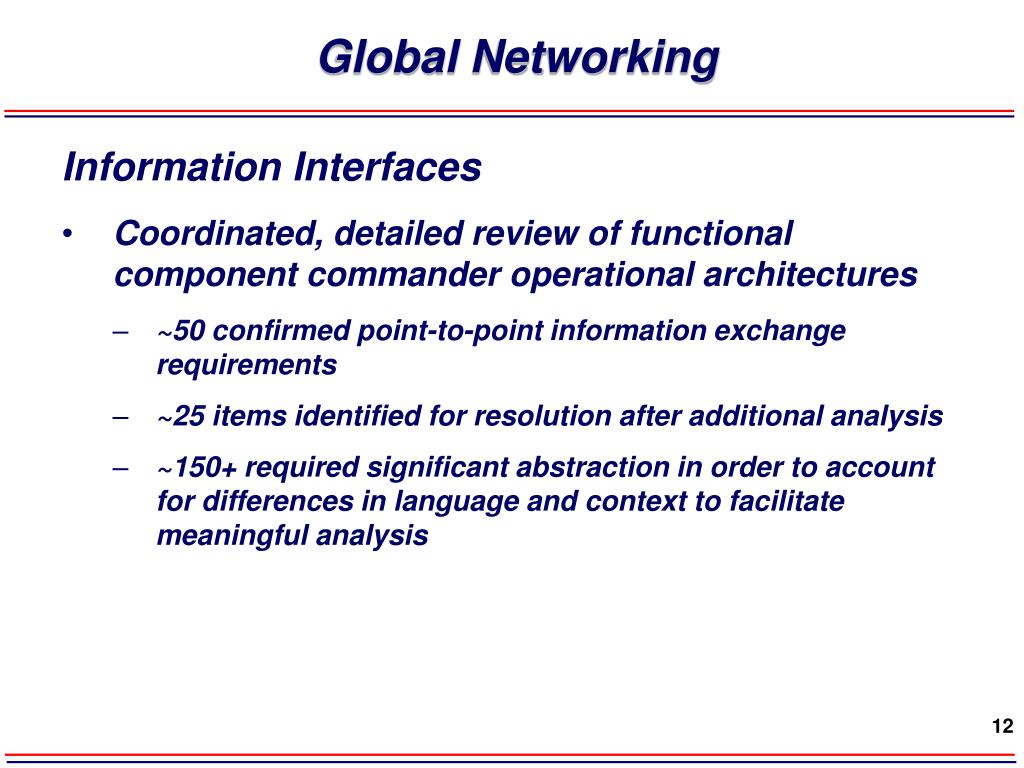 Global Networking Information Interfaces • Coordinated, detailed review of functional component commander operational architectures • ~50 confirmed point-to-point information exchange requirements • ~25 items identified for resolution after additional analysis • ~150+ required significant abstraction in order to account for differences in language and context to facilitate meaningful analysis
