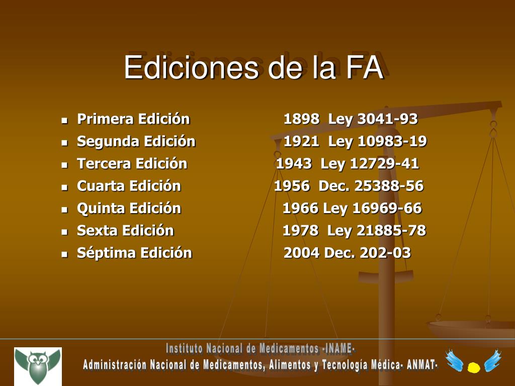 Ediciones de la FA • Primera Edición 1898 Ley 3041-93 • Segunda Edición 1921 Ley 10983-19 • Tercera Edición 1943 Ley 12729-41 • Cuarta Edición 1956 Dec. 25388-56 • Quinta Edición 1966 Ley 16969-66 • Sexta Edición 1978 Ley 21885-78 • Séptima Edición 2004 Dec. 202-03 Instituto Nacional de Medicamentos -INAME- Administración Nacional de Medicamentos, Alimentos y Tecnología Médica- ANMAT-