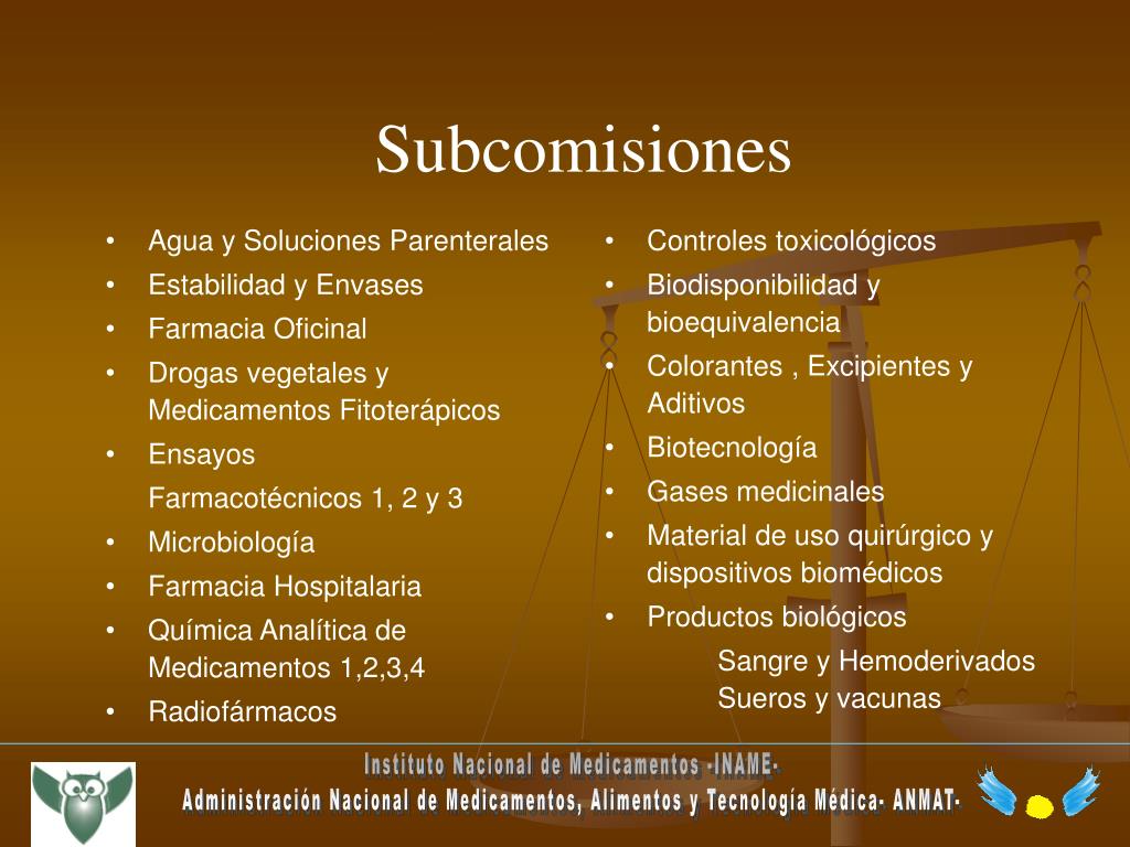 Subcomisiones • Agua y Soluciones Parenterales • Estabilidad y Envases • Farmacia Oficinal • Drogas vegetales y Medicamentos Fitoterápicos • Ensayos • Farmacotécnicos 1, 2 y 3 • Microbiología • Farmacia Hospitalaria • Química Analítica de Medicamentos 1,2,3,4 • Radiofármacos • Controles toxicológicos • Biodisponibilidad y bioequivalencia • Colorantes , Excipientes y Aditivos • Biotecnología • Gases medicinales • Material de uso quirúrgico y dispositivos biomédicos • Productos biológicos • Sangre y Hemoderivados Sueros y vacunas Instituto Nacional de Medicamentos -INAME- Administración Nacional de Medicamentos, Alimentos y Tecnología Médica- ANMAT-