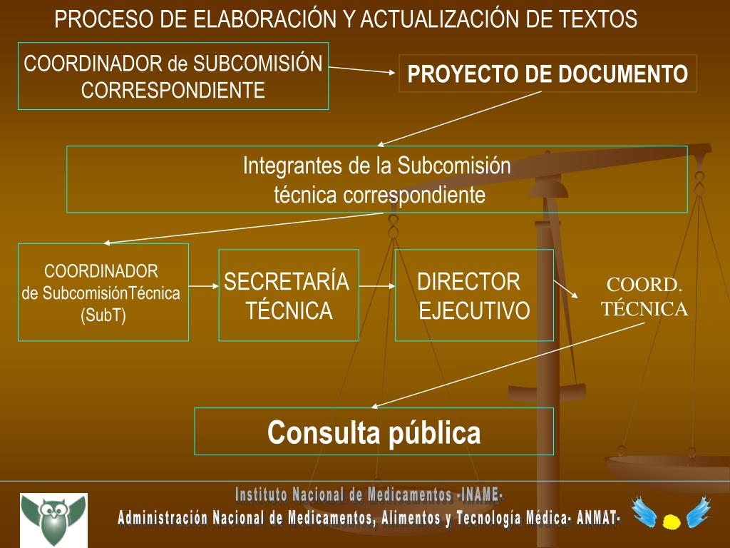 PROCESO DE ELABORACIÓN Y ACTUALIZACIÓN DE TEXTOS COORDINADOR de SUBCOMISIÓN CORRESPONDIENTE PROYECTO DE DOCUMENTO Integrantes de la Subcomisión técnica correspondiente COORDINADOR de SubcomisiónTécnica (SubT) SECRETARÍA TÉCNICA DIRECTOR EJECUTIVO COORD. TÉCNICA Consulta pública Instituto Nacional de Medicamentos -INAME- Administración Nacional de Medicamentos, Alimentos y Tecnología Médica- ANMAT-