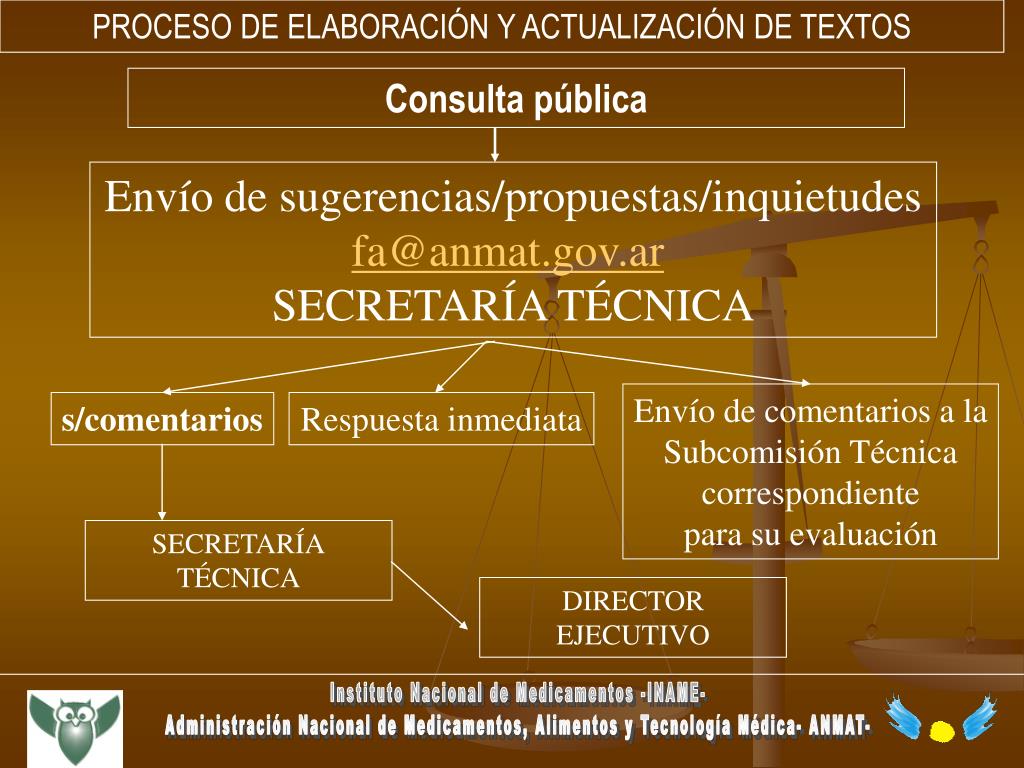 PROCESO DE ELABORACIÓN Y ACTUALIZACIÓN DE TEXTOS Consulta pública Envío de sugerencias/propuestas/inquietudes fa@anmat.gov.ar SECRETARÍA TÉCNICA Envío de comentarios a la Subcomisión Técnica correspondiente para su evaluación s/comentarios Respuesta inmediata SECRETARÍA TÉCNICA DIRECTOR EJECUTIVO Instituto Nacional de Medicamentos -INAME- Administración Nacional de Medicamentos, Alimentos y Tecnología Médica- ANMAT-