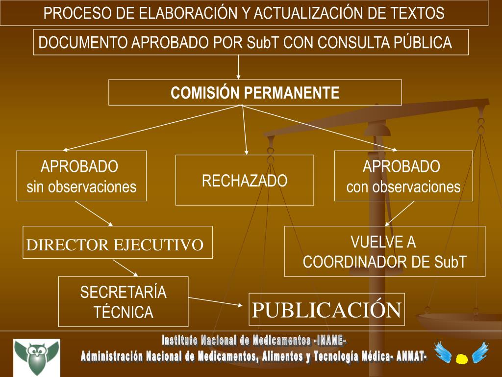 PROCESO DE ELABORACIÓN Y ACTUALIZACIÓN DE TEXTOS DOCUMENTO APROBADO POR SubT CON CONSULTA PÚBLICA COMISIÓN PERMANENTE APROBADO sin observaciones APROBADO con observaciones RECHAZADO DIRECTOR EJECUTIVO VUELVE A COORDINADOR DE SubT SECRETARÍA TÉCNICA PUBLICACIÓN Instituto Nacional de Medicamentos -INAME- Administración Nacional de Medicamentos, Alimentos y Tecnología Médica- ANMAT-