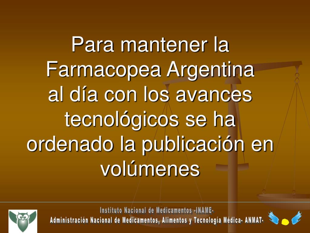 Para mantener la Farmacopea Argentinaal día con los avances tecnológicos se ha ordenado la publicación en volúmenes Instituto Nacional de Medicamentos -INAME- Administración Nacional de Medicamentos, Alimentos y Tecnología Médica- ANMAT-