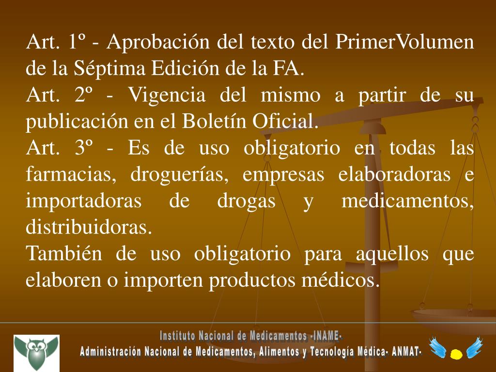 Art. 1º - Aprobación del texto del PrimerVolumen de la Séptima Edición de la FA. Art. 2º - Vigencia del mismo a partir de su publicación en el Boletín Oficial. Art. 3º - Es de uso obligatorio en todas las farmacias, droguerías, empresas elaboradoras e importadoras de drogas y medicamentos, distribuidoras. También de uso obligatorio para aquellos que elaboren o importen productos médicos. Instituto Nacional de Medicamentos -INAME- Administración Nacional de Medicamentos, Alimentos y Tecnología Médica- ANMAT-