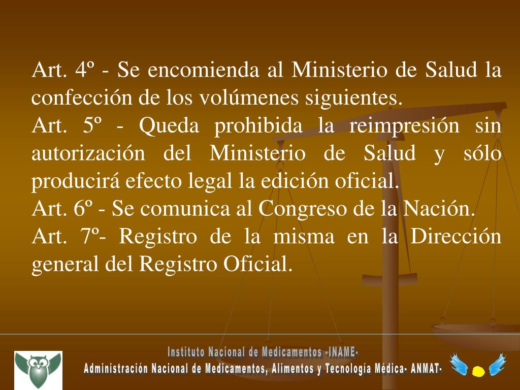 Art. 4º - Se encomienda al Ministerio de Salud la confección de los volúmenes siguientes. Art. 5º - Queda prohibida la reimpresión sin autorización del Ministerio de Salud y sólo producirá efecto legal la edición oficial. Art. 6º - Se comunica al Congreso de la Nación. Art. 7º- Registro de la misma en la Dirección general del Registro Oficial. Instituto Nacional de Medicamentos -INAME- Administración Nacional de Medicamentos, Alimentos y Tecnología Médica- ANMAT-