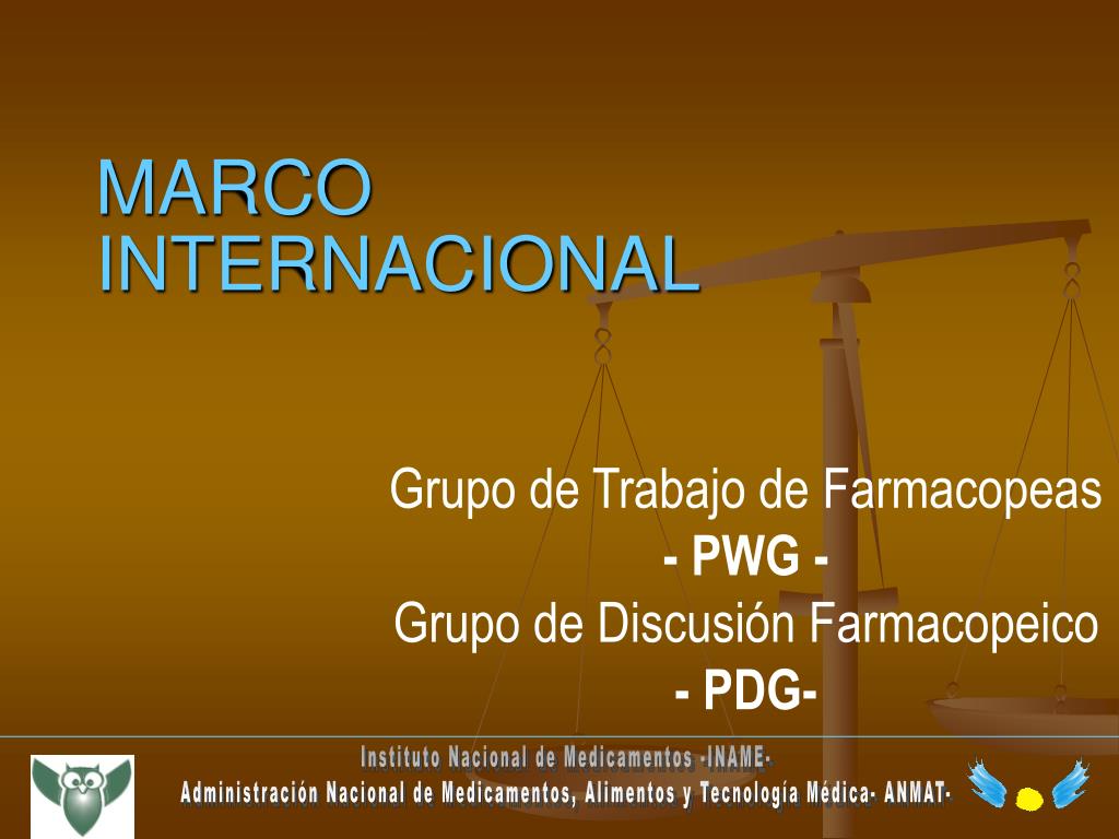 MARCO INTERNACIONAL Grupo de Trabajo de Farmacopeas - PWG - Grupo de Discusión Farmacopeico - PDG- Instituto Nacional de Medicamentos -INAME- Administración Nacional de Medicamentos, Alimentos y Tecnología Médica- ANMAT-