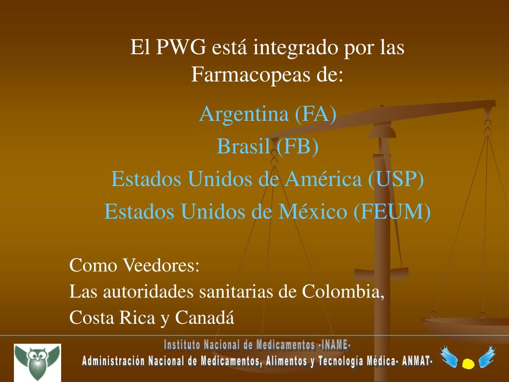 El PWG está integrado por las Farmacopeas de: Argentina (FA) Brasil (FB) Estados Unidos de América (USP) Estados Unidos de México (FEUM) Como Veedores: Las autoridades sanitarias de Colombia, Costa Rica y Canadá Instituto Nacional de Medicamentos -INAME- Administración Nacional de Medicamentos, Alimentos y Tecnología Médica- ANMAT-