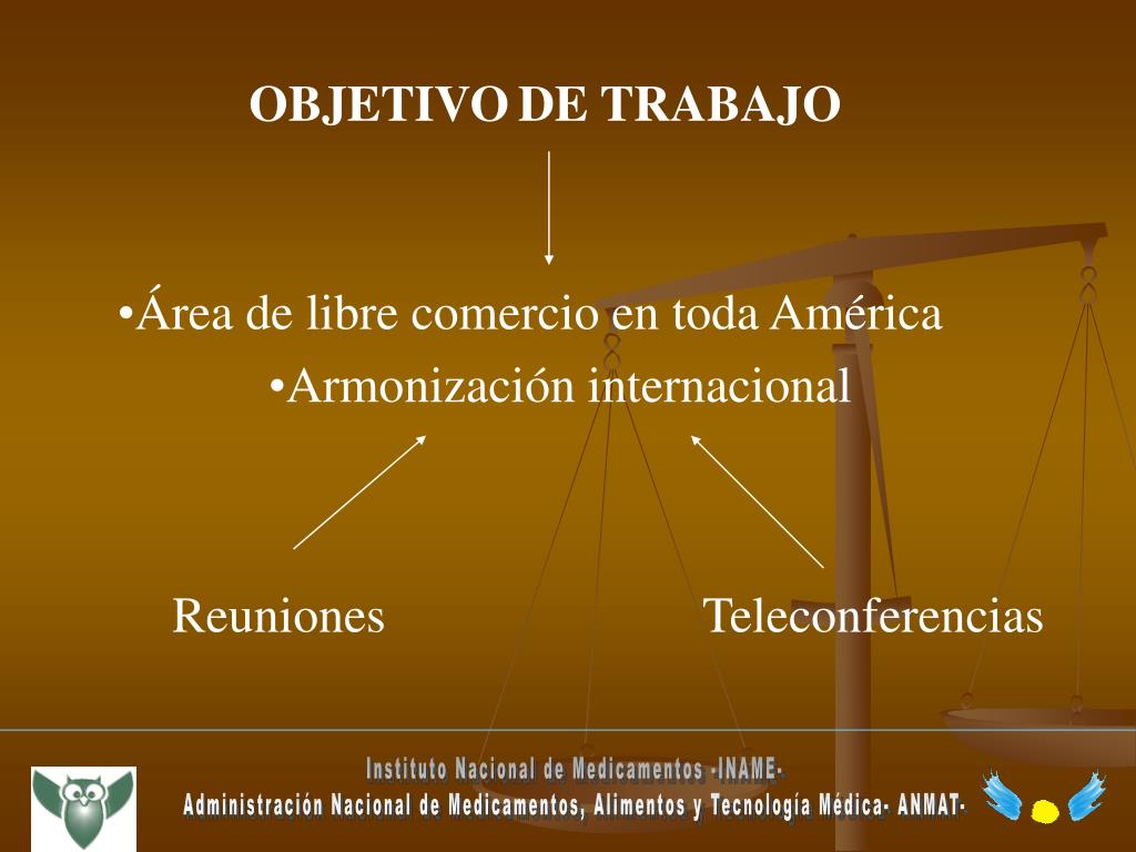 OBJETIVODE TRABAJO • Área de libre comercio en toda América • Armonización internacional Reuniones Teleconferencias Instituto Nacional de Medicamentos -INAME- Administración Nacional de Medicamentos, Alimentos y Tecnología Médica- ANMAT-