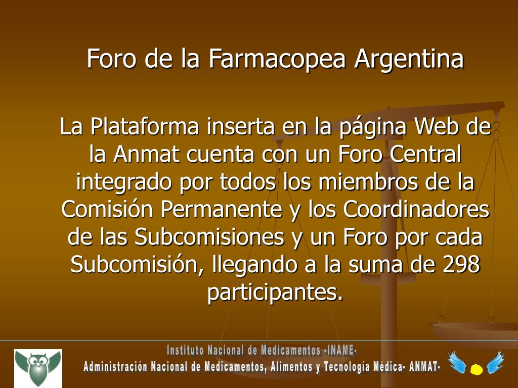 Foro de la Farmacopea Argentina La Plataforma inserta en la página Web de la Anmat cuenta con un Foro Central integrado por todos los miembros de la Comisión Permanente y los Coordinadores de las Subcomisiones y un Foro por cada Subcomisión, llegando a la suma de 298 participantes. Instituto Nacional de Medicamentos -INAME- Administración Nacional de Medicamentos, Alimentos y Tecnología Médica- ANMAT-