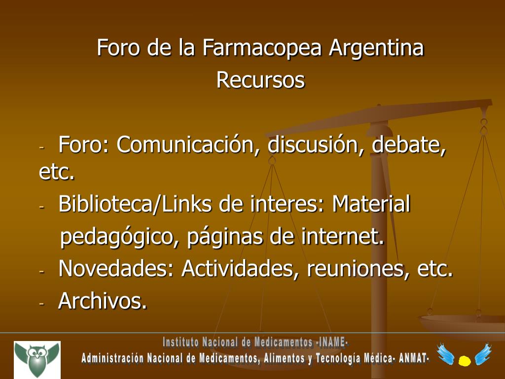 Foro de la Farmacopea Argentina Recursos Foro: Comunicación, discusión, debate, etc. Biblioteca/Links de interes: Material pedagógico, páginas de internet. Novedades: Actividades, reuniones, etc. Archivos. Instituto Nacional de Medicamentos -INAME- Administración Nacional de Medicamentos, Alimentos y Tecnología Médica- ANMAT-