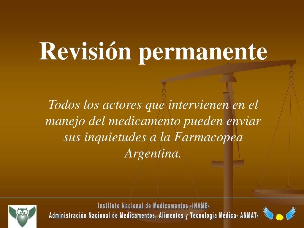 Revisión permanente Todos los actores que intervienen en el manejo del medicamento pueden enviar sus inquietudes a la Farmacopea Argentina. Instituto Nacional de Medicamentos -INAME- Administración Nacional de Medicamentos, Alimentos y Tecnología Médica- ANMAT-