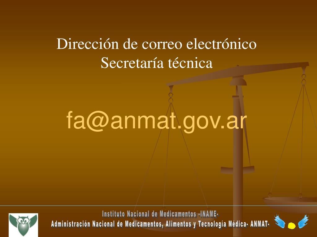 Dirección de correo electrónico Secretaría técnica fa@anmat.gov.ar Instituto Nacional de Medicamentos -INAME- Administración Nacional de Medicamentos, Alimentos y Tecnología Médica- ANMAT-