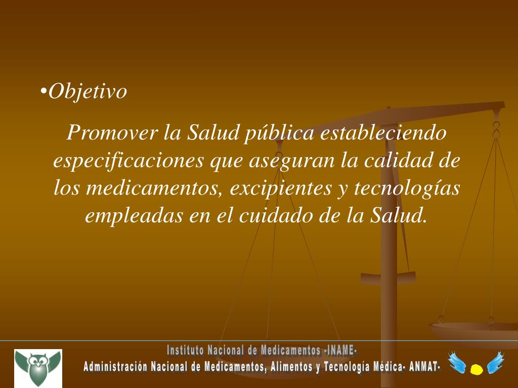 Objetivo • Promover la Salud pública estableciendo especificaciones que aseguran la calidad de los medicamentos, excipientes y tecnologías empleadas en el cuidado de la Salud. Instituto Nacional de Medicamentos -INAME- Administración Nacional de Medicamentos, Alimentos y Tecnología Médica- ANMAT-