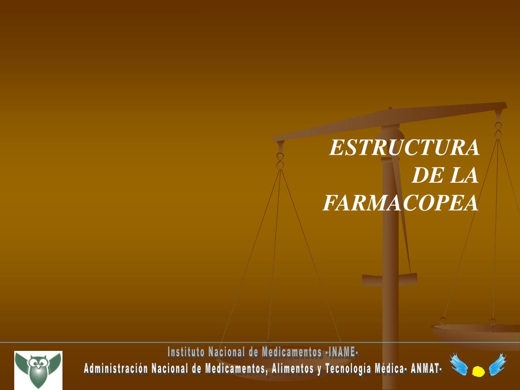 ESTRUCTURA DE LA FARMACOPEA Instituto Nacional de Medicamentos -INAME- Administración Nacional de Medicamentos, Alimentos y Tecnología Médica- ANMAT-