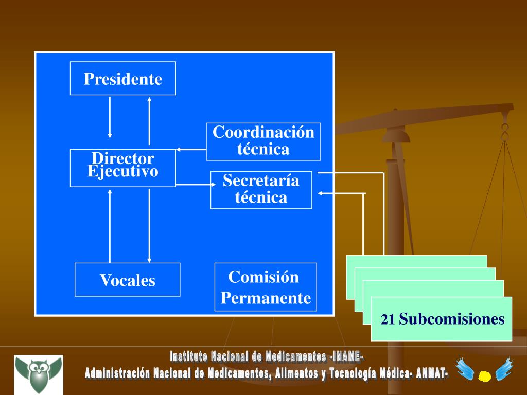 Presidente Coordinación técnica Director Ejecutivo Secretaría técnica Vocales Comisión Permanente 21 Subcomisiones Instituto Nacional de Medicamentos -INAME- Administración Nacional de Medicamentos, Alimentos y Tecnología Médica- ANMAT-