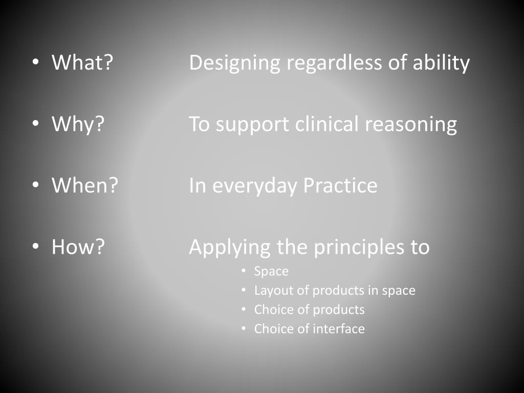 What? Designing regardless of ability • Why? To support clinical reasoning • When? In everyday Practice • How? Applying the principles to • Space • Layout of products in space • Choice of products • Choice of interface