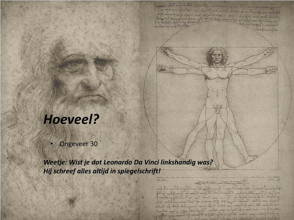 Hoeveel? • Ongeveer 30 Weetje: Wist je dat Leonardo Da Vinci linkshandig was? Hij schreef alles altijd in spiegelschrift!