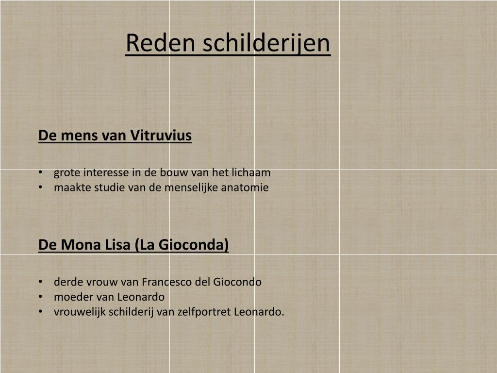 Reden schilderijen • De mens van Vitruvius • grote interesse in de bouw van het lichaam • maakte studie van de menselijke anatomie • De Mona Lisa (La Gioconda) • derde vrouw van Francesco del Giocondo • moeder van Leonardo • vrouwelijk schilderij van zelfportret Leonardo.