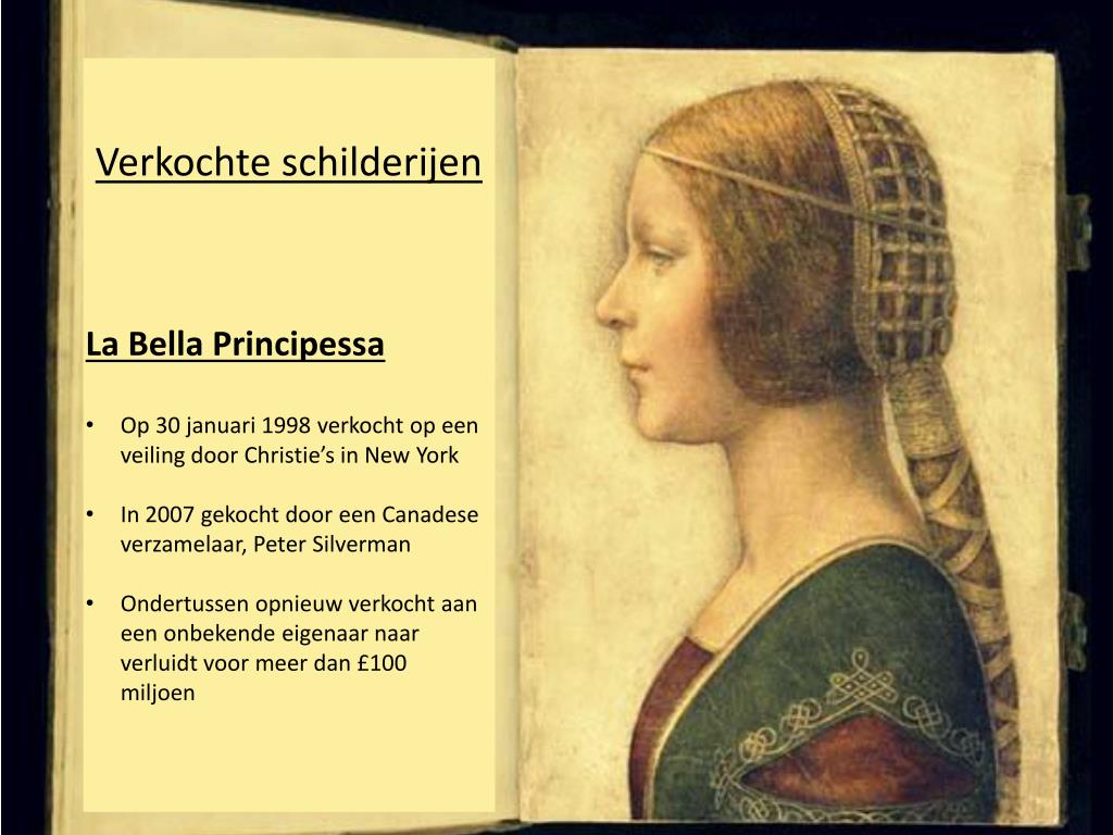 Verkochte schilderijen • La Bella Principessa • Op 30 januari 1998 verkocht op een veiling door Christie’s in New York • In 2007 gekocht door een Canadese verzamelaar, Peter Silverman • Ondertussen opnieuw verkocht aan een onbekende eigenaar naar verluidt voor meer dan £100 miljoen