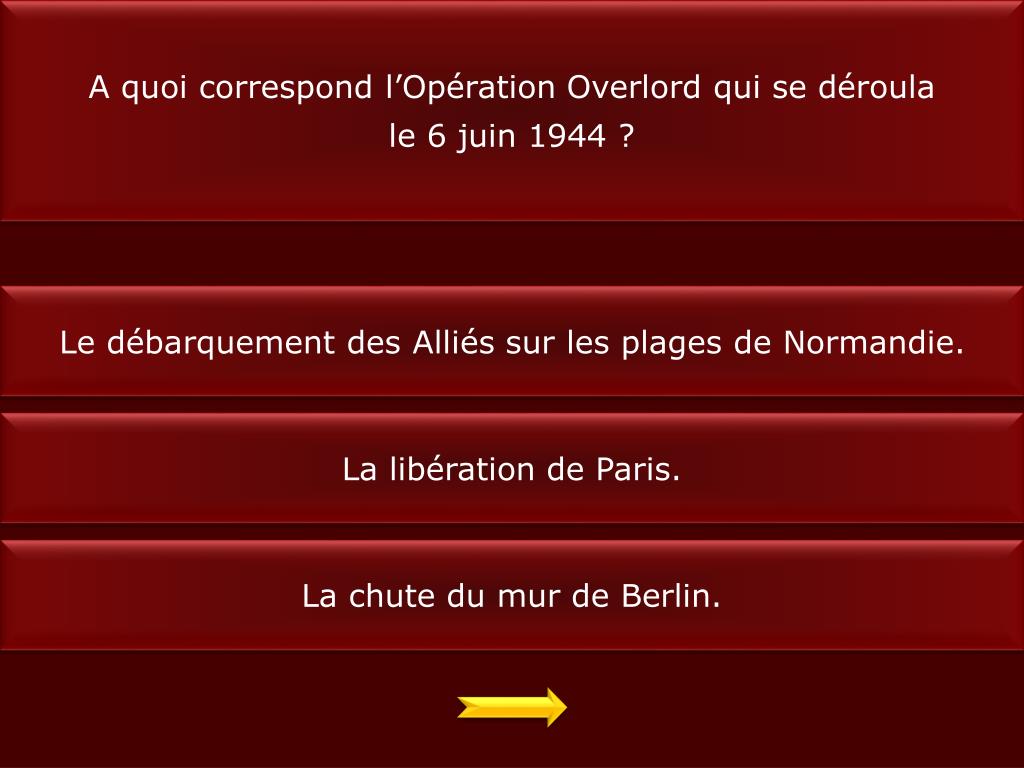 A quoi correspond l’Opération Overlord qui se déroula le 6 juin 1944 ? Le débarquement des Alliés sur les plages de Normandie. La libération de Paris. La chute du mur de Berlin.