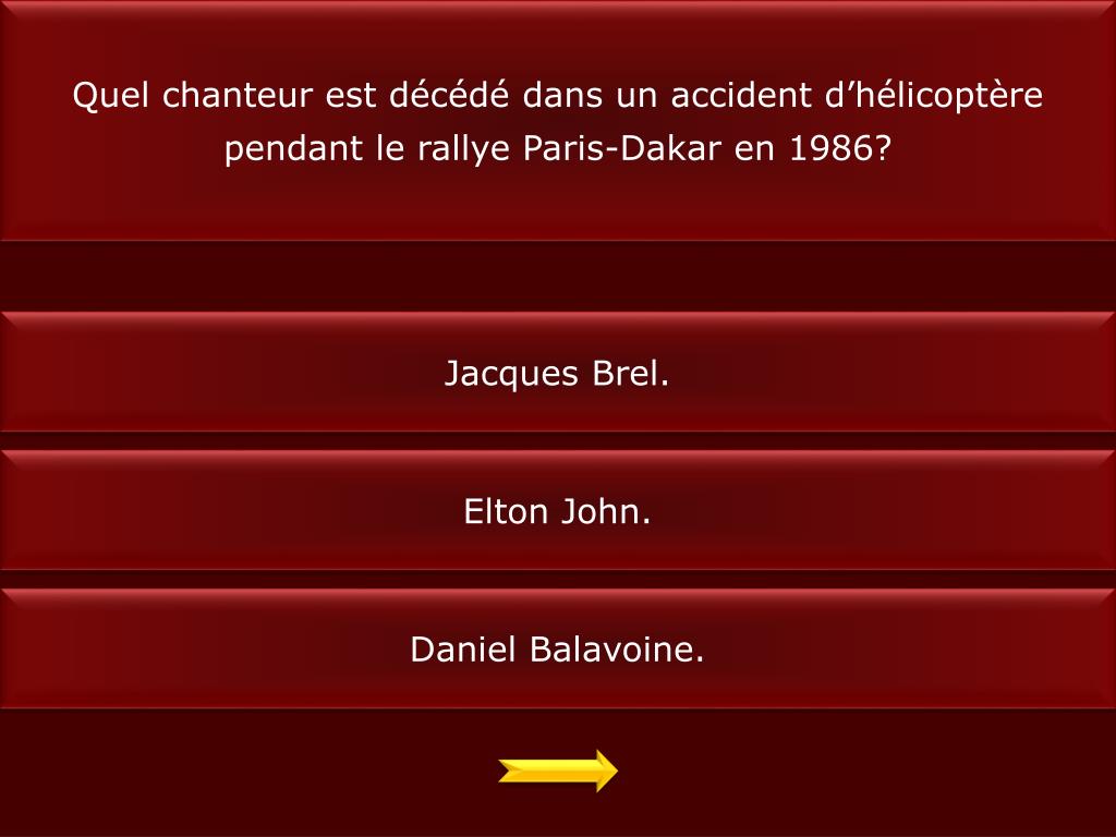 Quel chanteur est décédé dans un accident d’hélicoptère pendant le rallye Paris-Dakar en 1986? Jacques Brel. Elton John. Daniel Balavoine.