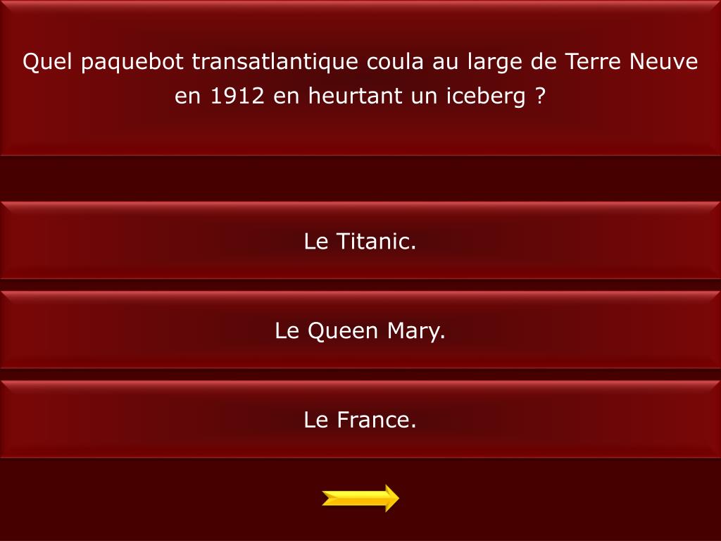 Quel paquebot transatlantique coula au large de Terre Neuve en 1912 en heurtant un iceberg ? Le Titanic. Le Queen Mary. Le France.