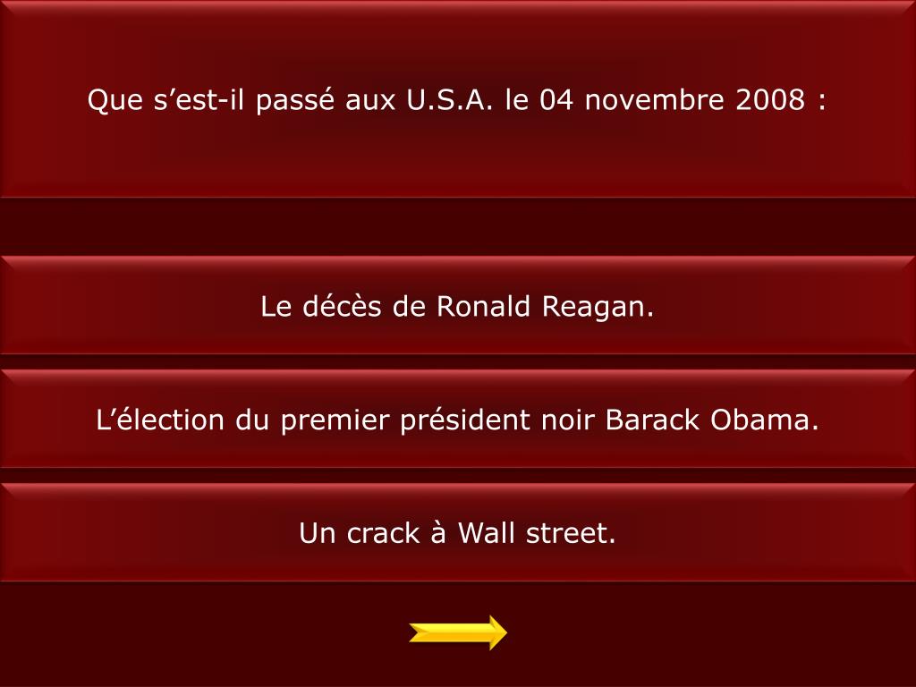 Que s’est-il passé aux U.S.A. le 04 novembre 2008 : Le décès de Ronald Reagan. L’élection du premier président noir BarackObama. Un crack à Wall street.