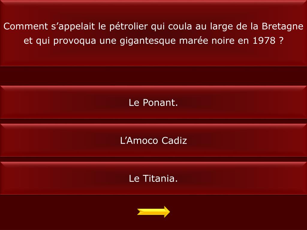 Comment s’appelait le pétrolier qui coula au large de la Bretagne et qui provoqua une gigantesque marée noire en 1978 ? Le Ponant. L’Amoco Cadiz Le Titania.