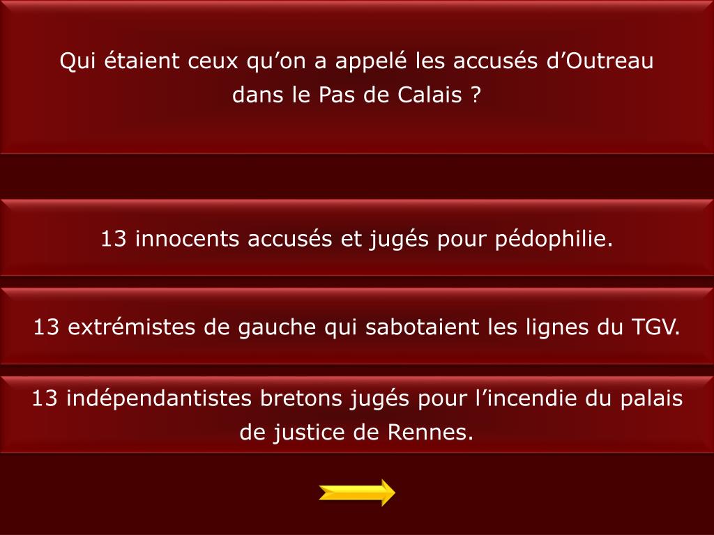 Qui étaient ceux qu’on a appelé les accusés d’Outreau dans le Pas de Calais ? 13 innocents accusés et jugés pour pédophilie. 13 extrémistes de gauche qui sabotaient les lignes du TGV. 13 indépendantistes bretons jugés pour l’incendie du palais de justice de Rennes.