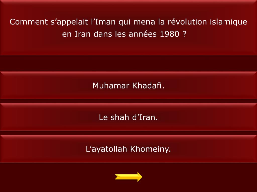Comment s’appelait l’Iman qui mena la révolution islamique en Iran dans les années 1980 ? MuhamarKhadafi. Le shah d’Iran. L’ayatollah Khomeiny.