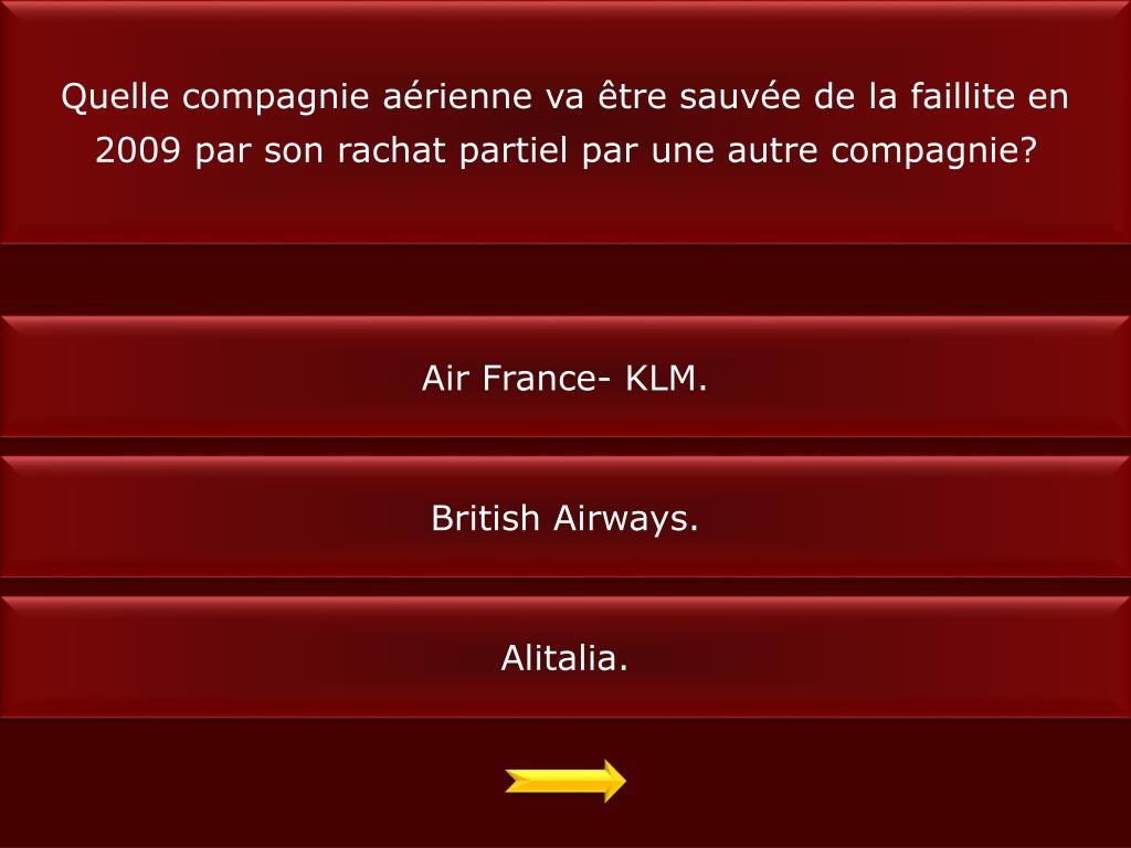 Quelle compagnie aérienne va être sauvée de la faillite en 2009 par son rachat partiel par une autre compagnie? Air France- KLM. British Airways. Alitalia.