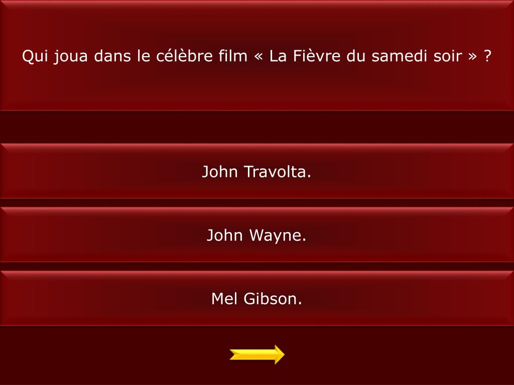 Qui joua dans le célèbre film « La Fièvre du samedi soir » ? John Travolta. John Wayne. Mel Gibson.