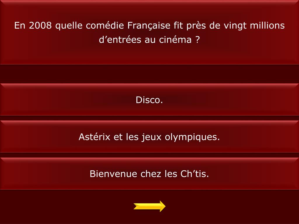En 2008 quelle comédie Française fit près de vingt millions d’entrées au cinéma ? Disco. Astérix et les jeux olympiques. Bienvenue chez les Ch’tis.