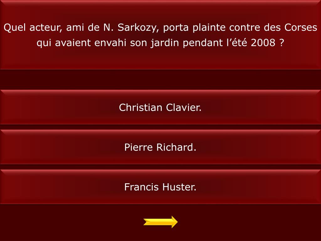 Quel acteur, ami de N. Sarkozy, porta plainte contre des Corses qui avaient envahi son jardin pendant l’été 2008 ? Christian Clavier. Pierre Richard. Francis Huster.