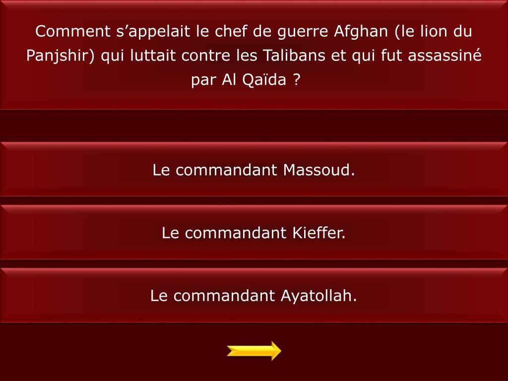 Comment s’appelait le chef de guerre Afghan (le lion du Panjshir) qui luttait contre les Talibans et qui fut assassiné par Al Qaïda ? Le commandant Massoud. Le commandant Kieffer. Le commandant Ayatollah.