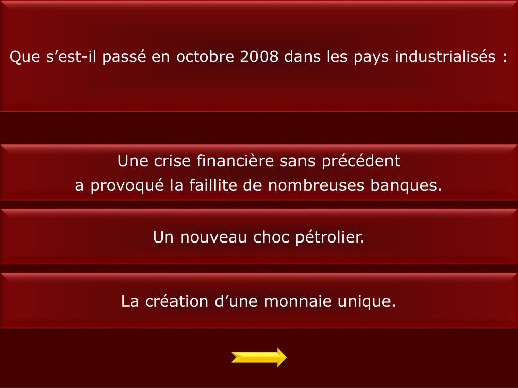 Que s’est-il passé en octobre 2008 dans les pays industrialisés : Une crise financière sans précédent a provoqué la faillite de nombreuses banques. Un nouveau choc pétrolier. La création d’une monnaie unique.