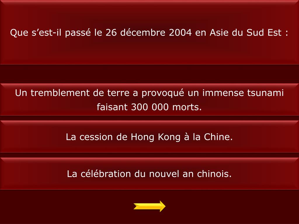 Que s’est-il passé le 26 décembre 2004 en Asie du Sud Est : Un tremblement de terre a provoqué un immense tsunami faisant 300 000 morts. La cession de Hong Kong à la Chine. La célébration du nouvel an chinois.
